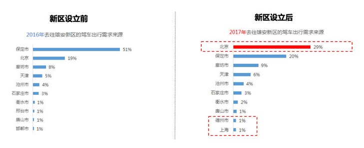新区设立后,去往新区的用户来源发生了明显的变化,来自北京用户的出行需求热度猛增,占比达到了29%,赶超保定成为了去往新区出行需求占比最大的城市。值得一提的是,除了北京、天津及河北的城市外,也有一小部分用户来自山东德州和上海等较远地区。