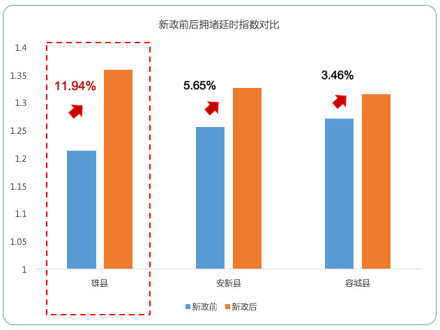 其中,雄县的6-22时拥堵延时指数从新政发布前的1.214提升到了1.359,上涨了11.94%,拥堵涨幅排名位列保定市的第1位,新安县和容城县也分别上涨了5.65%和3.46%,分列保定市拥堵涨幅排名的第4位和第5位。