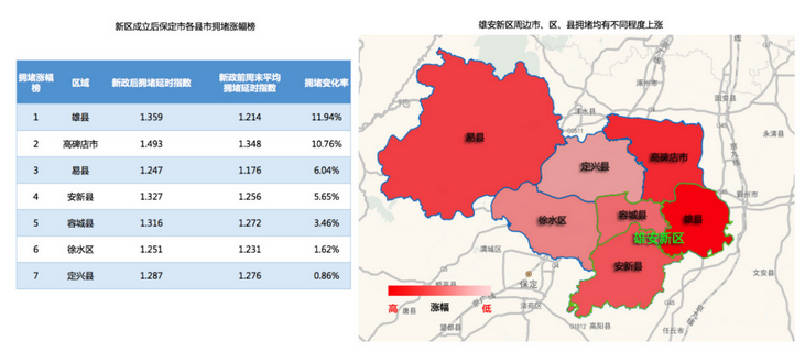 根据高德地图交通大数据分析,在新政发布后,雄安新区所覆盖的三个县拥堵均上涨明显,同时周边的高碑店市、定兴县、徐水区、易县等区县的拥堵程度相比新政发布前也均有不同程度的上涨。