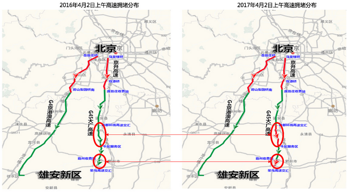 除此之外,在高速方面,根据高德大数据的监测,新区设立后,北京去往雄安新区的高速拥堵路段主要集中在G4京港澳高速、京开高速及G45大广高速。而相比去年同时期的高速拥堵路段后发现,北京去往雄安新区的高速主要拥堵路段在北京段基本相似,分别是G4京港澳高速岳各庄桥到房山梨园桥南路段、京开高速马家楼桥到双源桥及G45大广高速双源桥到庞各庄收费站。