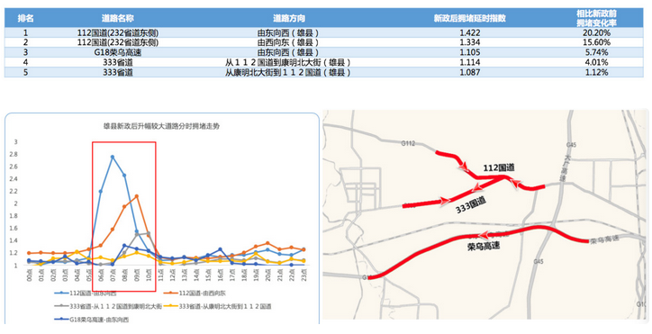 国道方面,新区设立后相比设立前雄县内112国道的拥堵有了大幅的上涨,双方向拥堵涨幅均超过了15%,其中由东向西的拥堵涨幅更是超过了20%,达到了20.20%,上午6点到10点最堵。此外雄县内荣乌高速、333省道的拥堵程度相比新区设立前也有不同程度的上涨。