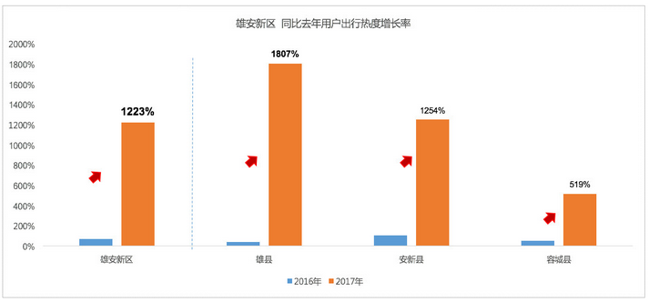 在导航规划前往新区的用户方面,相比新区设立前增长176%,而去年相同时间段仅上涨56%。新区包含的三县之中,去往安新县的增长出行热度增长最高,达215%。