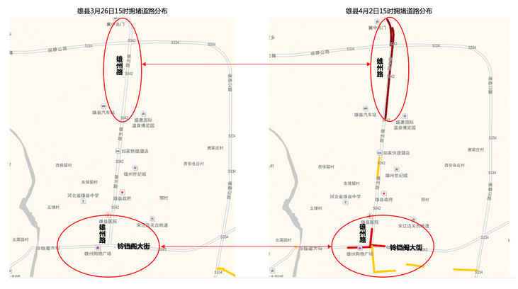 根据高德地图对比4月2日与一周前3月26日的拥堵数据来看,4月2日雄县内雄州路、铃铛阁大街均有明显的拥堵和缓行情况出现,而一周前的3月26日15点,雄县内道路均较为畅通,没有出现拥堵和缓行现象。