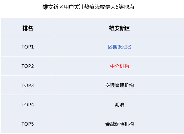 雄安新区设立后,从出行关注的具体地点类型来看,人们最关心雄安新区所在的具体地理位置,其次是中介机构(房产中介为主)。高德分析师称,可见很多去往雄安新区的人对于当地中介机构的位置信息比较感兴趣。