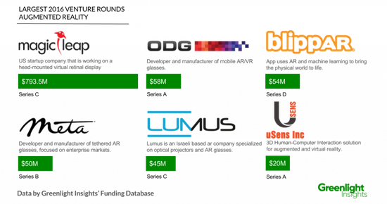 这标志着一个产业的兴起。Magic Leap在2016年风投中脱颖而出,但也是个例外,在早期融资中,大多数投资都低于100万美元。未来几年,随着企业后期资金的跟上,AR行业将继续增长。