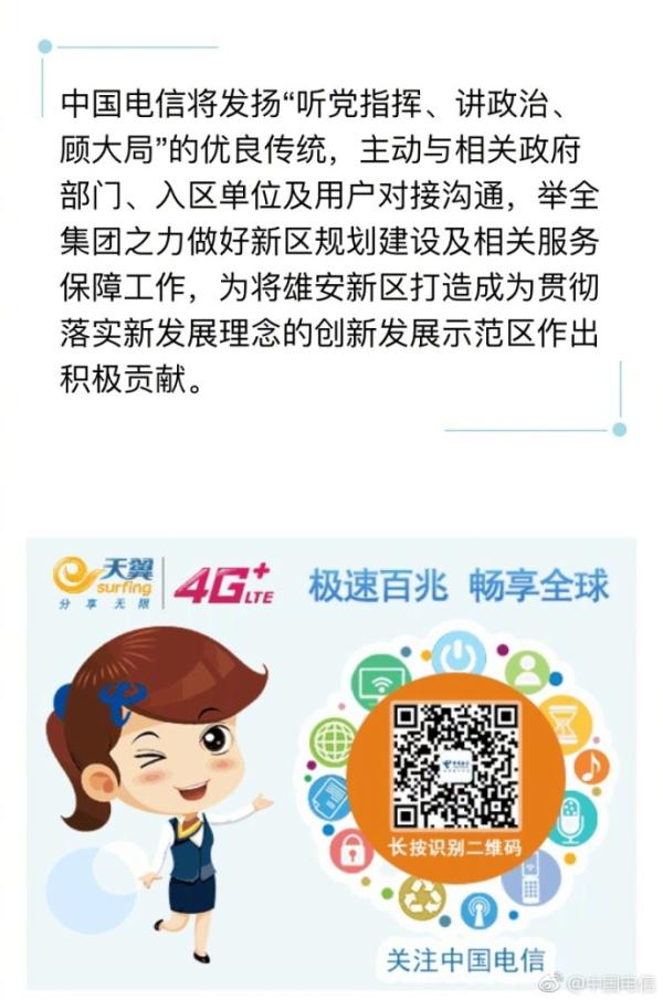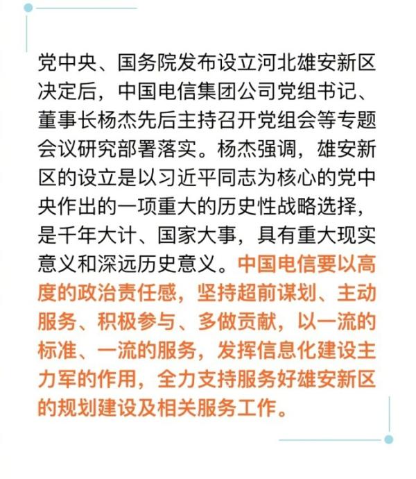 中国电信官方微博发布消息称,党中央、国务院发布设立河北雄安新区决定后,中国电信集团公司党组书记、董事长杨杰先后主持召开党组会等专题会议研究部署落实。中国电信将以国际领先标准助力雄安新区规划建设。