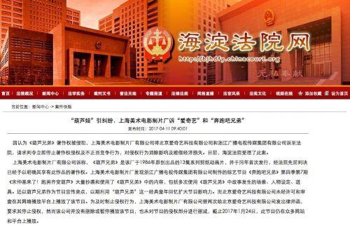 4月11日,海淀法院官网发布消息,因认为《葫芦兄弟》著作权被侵犯,上海美术电影制片厂有限公司将北京爱奇艺科技有限公司和浙江广播电视传媒集团有限公司诉至法院,请求判令立即停止著作权侵权及不正当竞争行为,对侵权行为消除影响及赔偿经济损失。