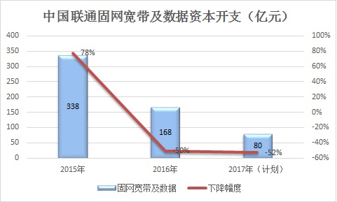 但是,两强相遇,毕竟有钱才是王道。从中国联通在2016年财报中披露的 资本开支计划来看,2017年其在固网宽带及数据领域的资本开支将进一步削减52%!这不由令人为为中国联通的光宽带+捏了把汗,这边厢要推千兆网络、双通道标准,那边厢却囊中空空无钱投入。