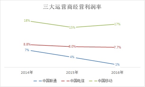 对比三大运营商2016年的经营利润率,在通信业务运营中每投入100元成本,中国移动能挣回17元,而中国联通则只能挣回1块钱。这堪称中国联通上市15年来的最差成绩。
