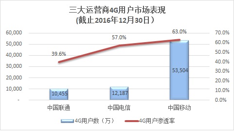 截止到2016年底,中国移动的4G用户数已经达到5.3亿,为全球4G用户规模最大的运营商,并且短短3年时间就实现了63%的4G用户渗透率;中国电信和中国联通的4G用户刚刚破亿,但中国电信的4G用户渗透率已达57%,而中国联通的4G用户渗透率才仅仅达到40%,说明其在拉动2/3G存量用户向4G迁移上严重落后。