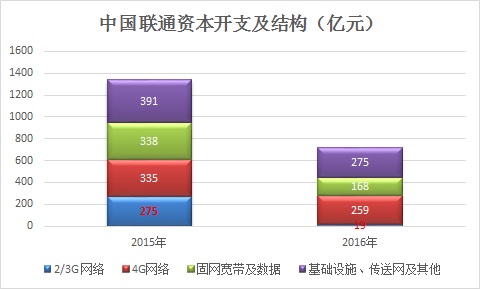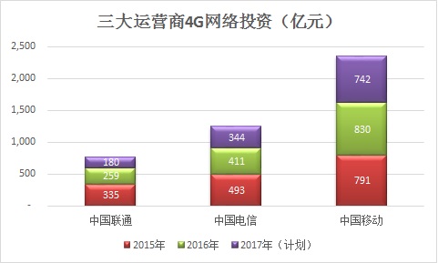 大规模的4G网络建设需要固定资本开支的大幅投入来支撑,加上2014年的806亿,中国移动三年间在4G网络上的投资已经高达2427亿元,并计划在2017年还要在4G网络上继续投资742亿。而中国联通在4G网络上的投资不足千亿,与中国电信相比也有较大的差距,并且还在2017年计划了30%的下降幅度。