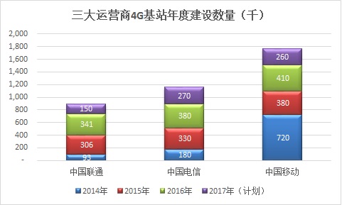 直到2015年初获得了LTE FDD的运营牌照之后,中国联通和中国电信才开始加大4G规模投入加快4G基站建设,同年完成30多万4G基站建设;到2016年5月中国电信和中国联通再获政策扶持,获批在800M、900M的低频段部署4G网络,同年又各建成近40万4G基站。但作为领先者的中国移动却毫不放松,在2015年和2016年连续两年在原有4G网络投资计划上追加10%以继续保持4G建站数量的绝对优势。
