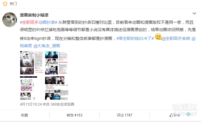 然而,一波未平一波又起,昨日,又有网友指出,动画《全职高手》叶修扛猪吃泡面等等细节原著小说没有的,却是《全职高手》漫画的原创内容,而由于《全职高手》的动画、漫画作品是由不同公司创作,所以《全职高手》动画涉嫌抄袭。