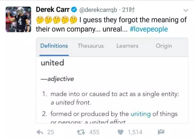 在推特上,奥克兰突袭者队的明星四分卫德里克-卡尔发文表示:“可能这个公司自己都忘了“联合”(United)是什么意思,并附上了这个词的词典解释。”