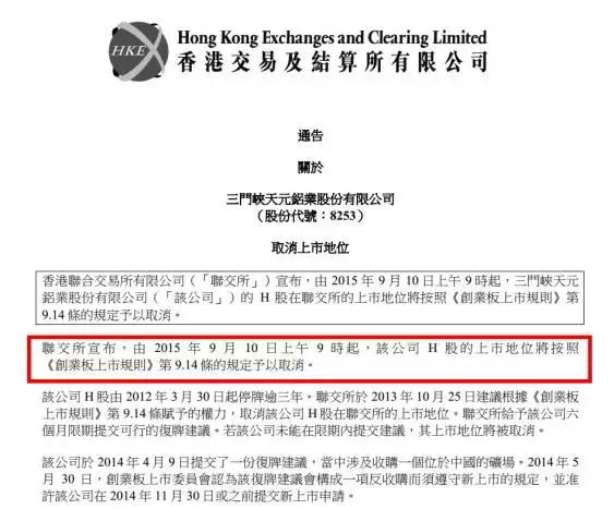 根据港交所2015年9月8日的公告,天元铝业的上市地位当日被正式取消(注意:自2012年起一直停牌)。而天元铝业的第一大股东,正是李留法及其妻李凤娈控制的汝州天瑞实业有限公司。