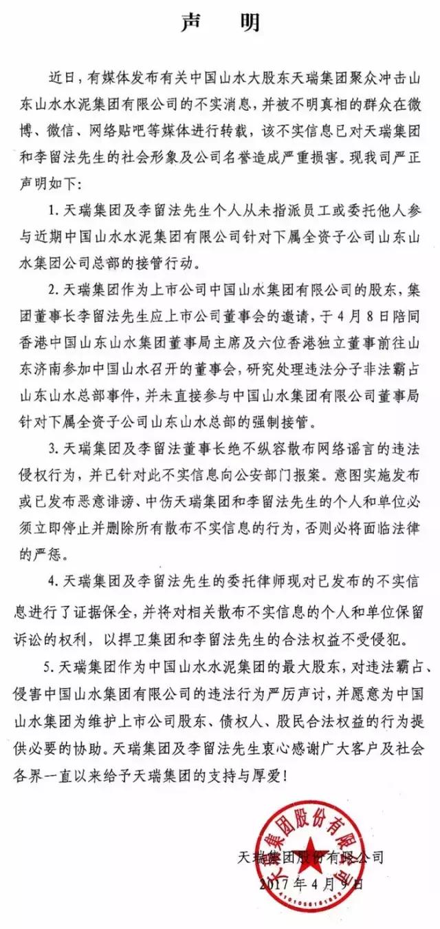 不过,天瑞集团随后在官网上发布声明表示,近日外界传言的有关公司冲击山水水泥的消息,并不属实,并同时声明公司及公司董事长李留法个人从未指派员工或委托他人参与近期山水集团针对下属全资子公司山水水泥总部的接管行动。