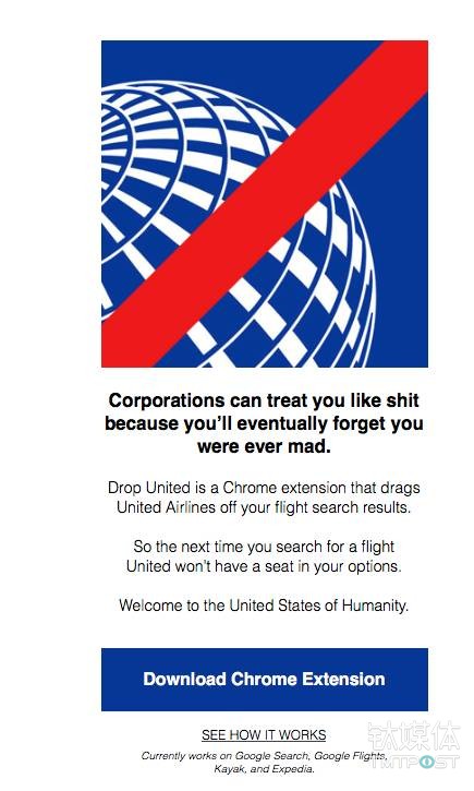 这是一个浏览器插件,它的作用是从Google以及几大机票搜索引擎的结果中移除美联航相关的结果,昨天在Hacker news上还被顶到了前几名位置。