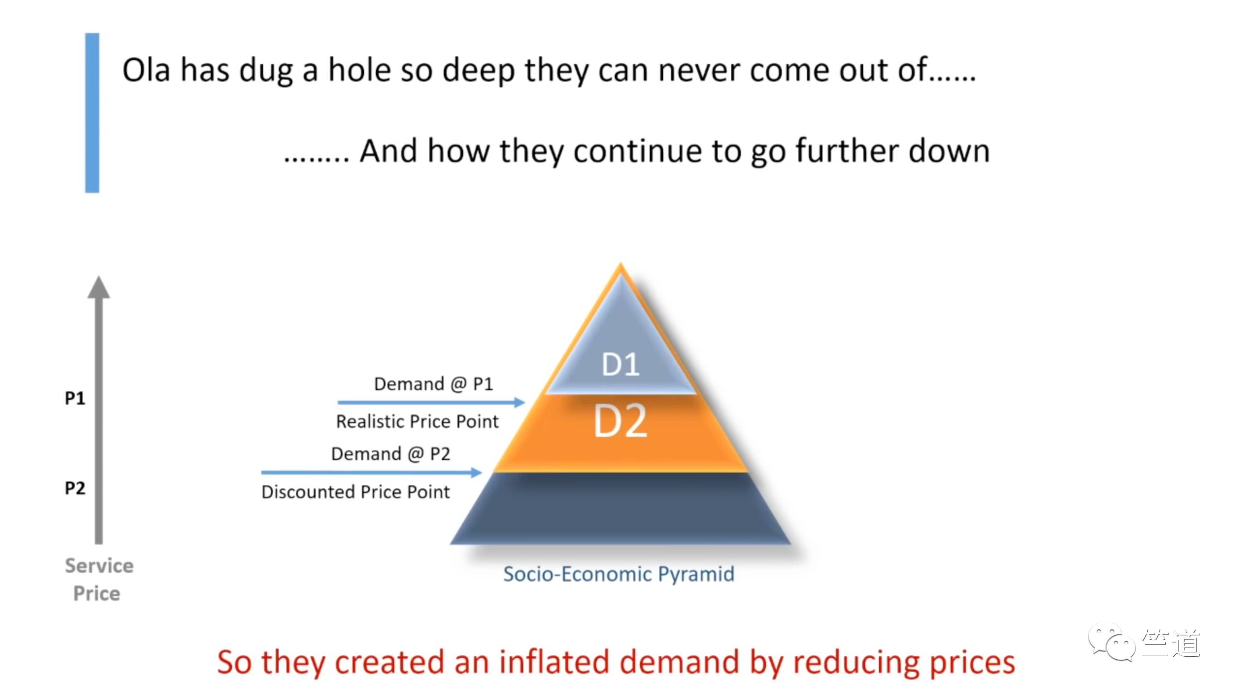 但是向Ola这样的网约车平台开始疯狂烧钱补贴扩张,希望用钱换来司机的忠诚度和市场份额。由此产生了被补贴催热的网约车市场D2,此区间的价格只是过去的一半,低价策略刺激了消费者消费,使得D2区间的市场需求比正常的需求区间更大。
