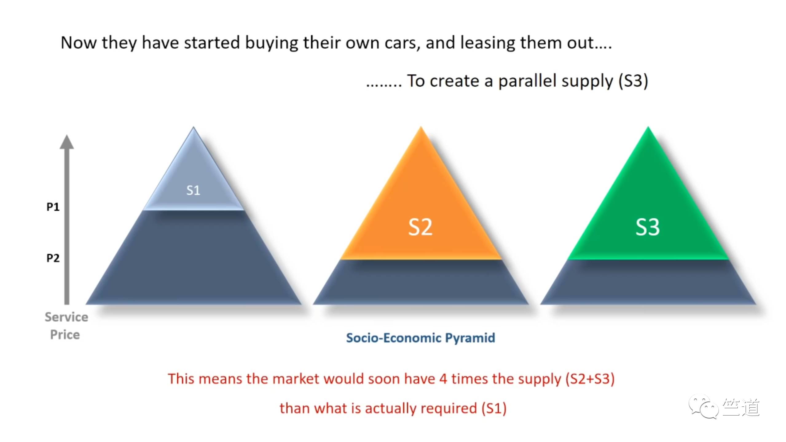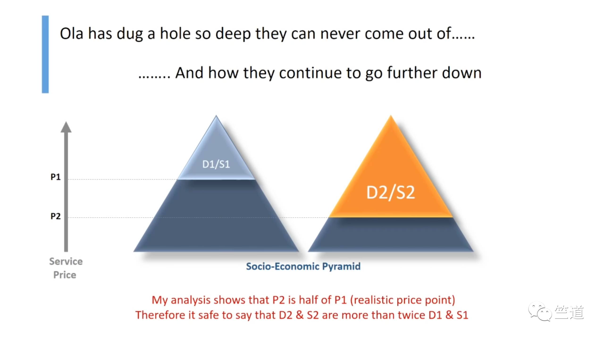 令情况变得更糟的是,Ola开始自己购买汽车然后出租给司机,希望以此方式控制更多司机资源。也由此产生了额外的供给S3,此时的Ola彻底陷入了烧钱的无敌深渊。随着市场份额的不断扩大,Ola烧的钱也就越多。其结果必然是数以亿计的烧钱大战。