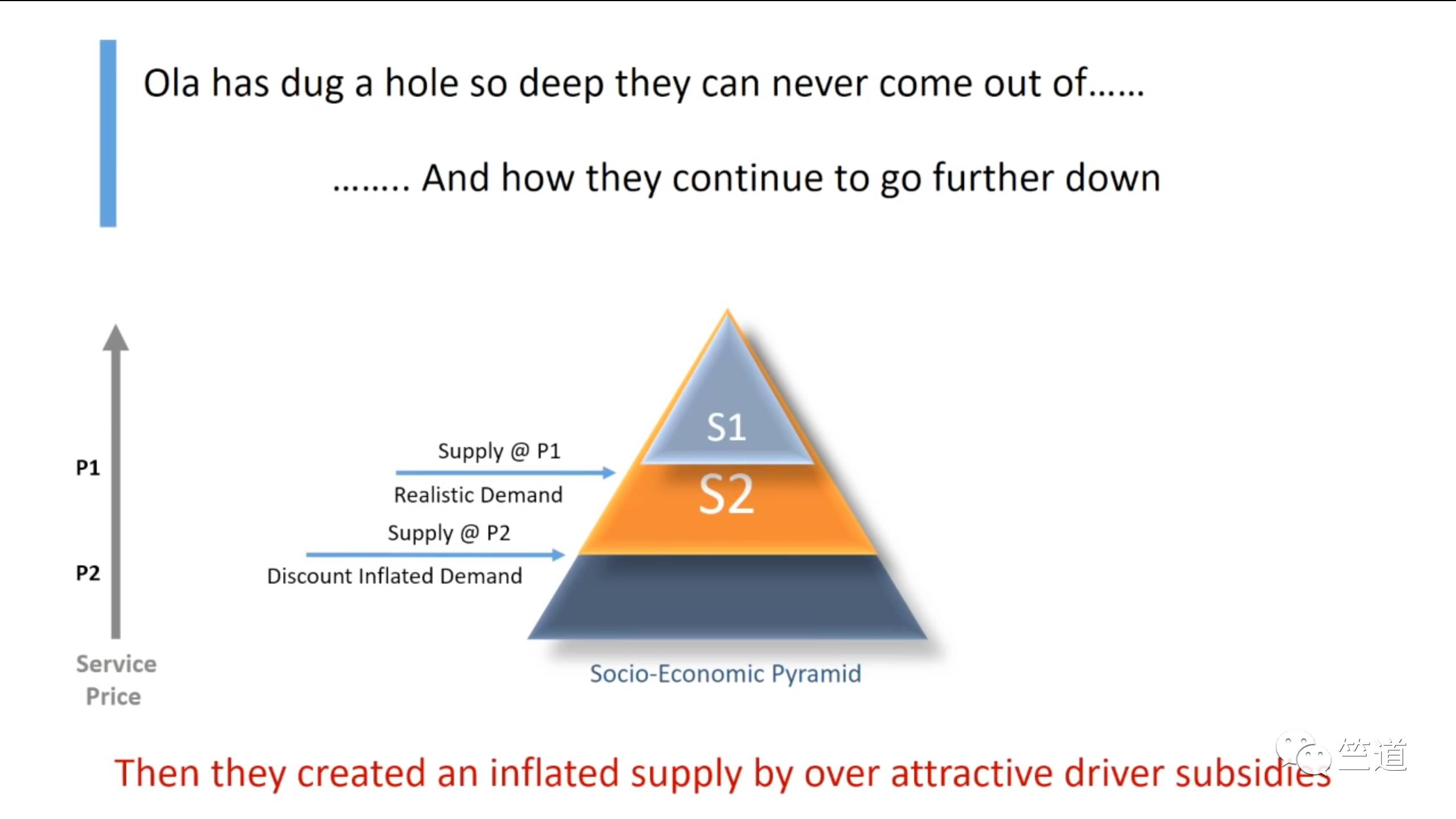 同理,代表市场S1的市场供给(出租车和司机数量)属于正常范围,但Ola以补贴的方式吸引司机加入。由此产生了比正常出租车和司机数量多很多的催热供给区间S2。