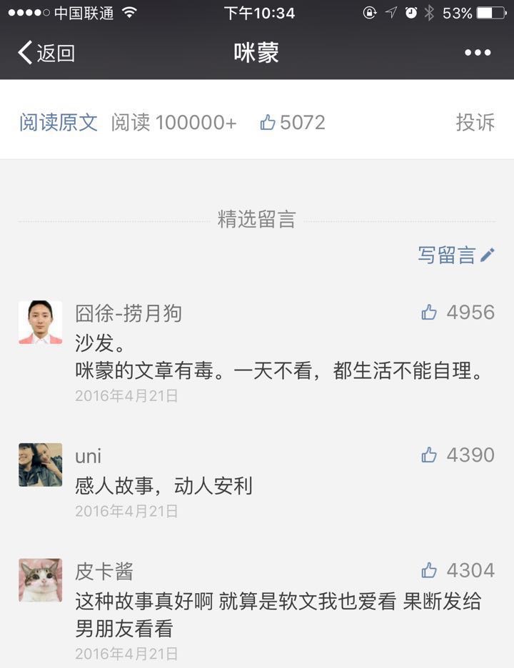 我在2015年下半年看到媒体采访咪蒙,就关注了她,深夜猫在被窝里看了她写的很多文章,有一些写得很爽的文章,结果是软文,反正篇篇都是10万+。