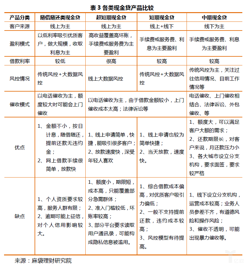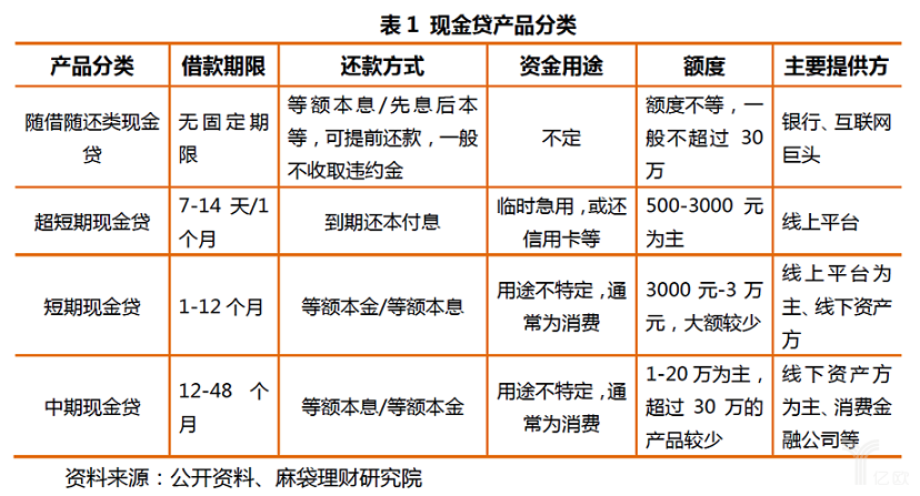 根据目前市场上的现金贷业务种类,可以分为随借随还类贷款、超短期贷款(类似国外发薪日贷款)、短期贷款、中期贷款四大类。