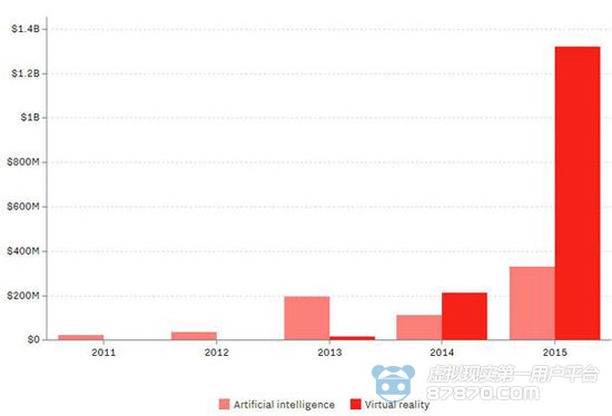 近几年,AI和VR这两个领域的研究一直很火。2015年,中国投资者在这两个领域的投资可以说是直线上涨,尤其是VR,2013年中国企业才开始在该领域注入资金,到2015年就飙升到了13亿+,AI也增加了两倍。