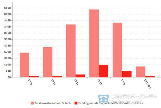 然而,近两年来,美国科技初创公司融资热度已有消减趋势,从已知的2016年全年数据来看,其中部分原因或许可以归于中国企业对美投资数额减少,参与的融资数额较前年下降了50%。而且,目前从2017年第一季度的数据来看,今年的融资总额以及中国企业占比也将下降。