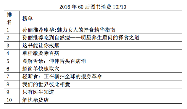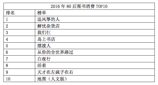 2016女性最爱TOP10为《追风筝的人》《解忧杂货店》《从你的全世界路过》《好吗好的》《天才在左疯子在右》《我们仨》《摆渡人》《活着》《白夜行》《岛上书店》。女性对于阅读趋势更为敏感,从《秘密花园》 到《天才在左 疯子在右》,女性引领了阅读风潮,国民图书消费从分享派文艺风转向内在探索的心理系。