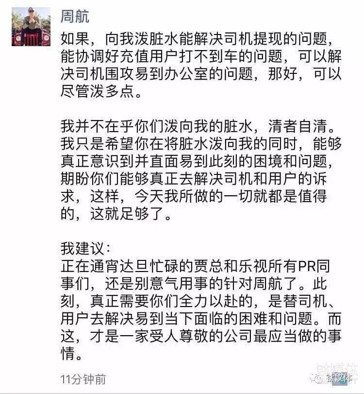 今天凌晨,周航在朋友圈再次声明回应称,清者自清,希望乐视在向他泼脏水的同时,先去解决好司机和用户的诉求。
