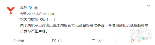 显然周航一句“乐视挪用易到13亿资金”的爆料,犹如掷入湖心的石子,激起千层浪。在晚上八点左右,易到在官微愤怒的抨击周航称其是“农夫与蛇现代版”。