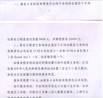 法院判决,被告小米科技有限责任公司于本判决生效后十日内向原告王顺虎退还货款9498元,并赔偿原告28494元。如不服本判决,可在判决书送达之日起十五日内,向本院递交上诉状,并按对方当事人的人数提出副本,上诉于山西省运城市中级人民法院。