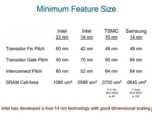 最典型的表现就是目前英特尔仍在沿用3年前的14纳米制程,而三星和台积电已经采用16纳米、14纳米和向10纳米和7纳米开进。而实际上线宽定义半导体工艺先进程度并不准确,更有意义的是栅极距(gate pitch)、鳍片间距(Fin Pitc)等,为此,业内对比过英特尔与台积电、三星的16、14nm工艺,结果英特尔的14nm工艺在这些关键指标上要比三星、台积电好得多,这两家的工艺其实有些名不副实,落后英特尔差不多1.5~2年左右的水平。