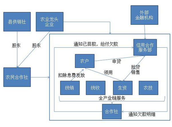 早期的合作模式主要是以当地的农村合作社会中转站,集养殖、收成以及成品贩卖等一整套流程为大循环。用个人或集体信用、抵押物、订单等作为切入点,由金融机构给养殖户提供资金和其他金融服务。