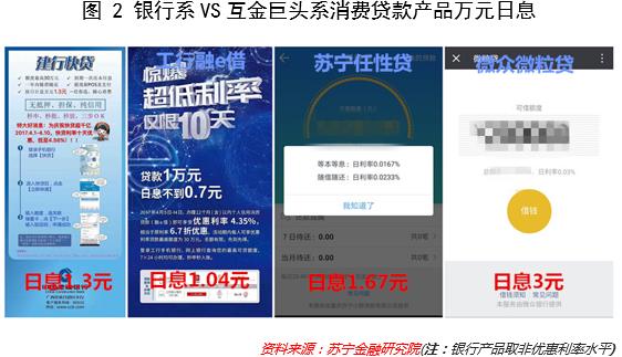 在消费金融上,一般有两个抓手:一是深挖信用卡场景,主打购车、账单、留学、教育、家装及循环透支和取现等业务,这对商业银行来讲是看家本领;二是推出主打消费的现金贷产品,借助低资金成本优势,以超低的利率切入市场,具有很强的市场震慑力(参见图2)。