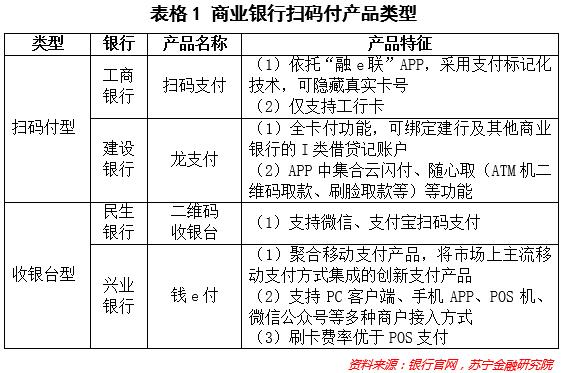 从当前银行业的产品布局看,目前主要包括扫码付和收银台两类产品,前者主要依托于手机银行APP,与第三方支付扫码直接竞争;后者则是扫码付的聚合支付产品,本质上是一个收银台,与第三方支付扫码是合作关系。