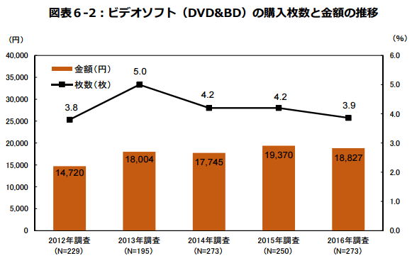 从下图中可以更为直接地看出光盘贩卖量的下降。2013年每人年均购买5份BD或DVD,到2016年时仅为3.9份,是近四年来的最低谷。