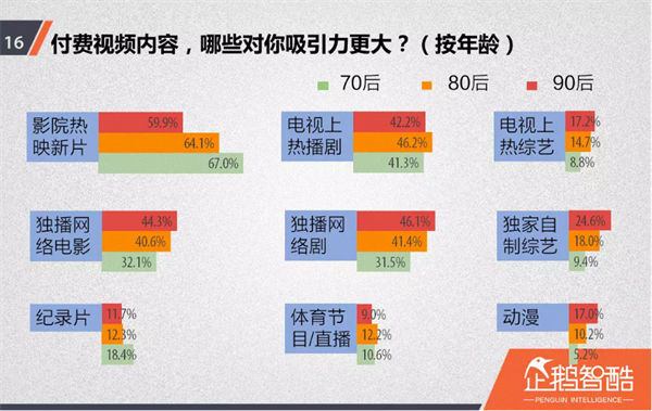 根据企鹅智库的调查研究,付费动画视频对用户的吸引力还是比较低的。不过其中的年龄层分段也很明显,90后对付费配信动画的支持度明显要高于其它,各大视频网站注重对独家动画的争夺,想必也是看中了这群年轻的消费群体。