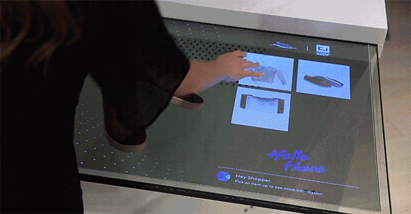 所有商品均被提前嵌入RFID标签,当消费者将选中商品靠近像素墙时,商品的信息就会自动在数码屏幕上显示出来。在互动桌面上,消费者可以在显示屏上按照各种分类对商品进行初步筛选,进而了解所选商品的具体信息。同时,显示屏还提供店内特定商品的摆放位置以及店内商品有无库存的信息。