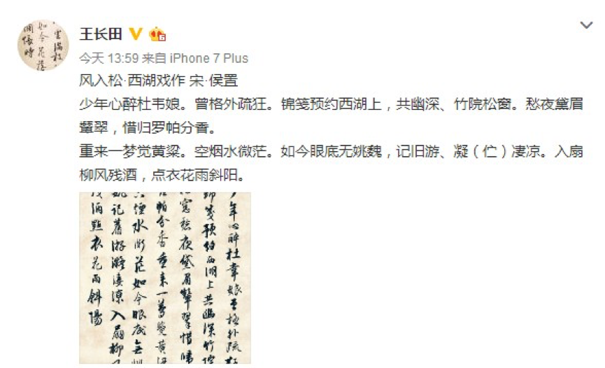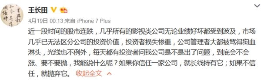 在发布2016年年报的前一天,光线传媒总裁王长田发了一篇微博。