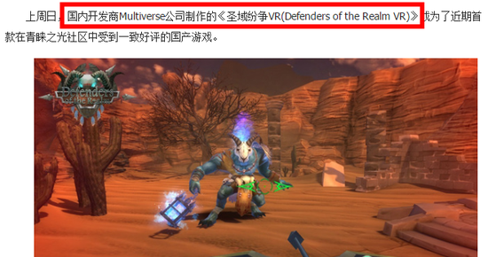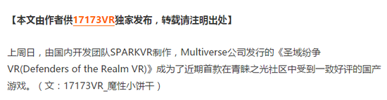 为了让Steam玩家来支持他们,17173VR游戏网站率先挂出了这款VR游戏的宣传稿《兽人必须死! 国产FPS《圣域纷争VR》将上线》,上面清楚的写到了游戏的开发团队为SPARKVR(火花幻境),发行商为Multiverse。之后便被一些游戏媒体、行业媒体转载。