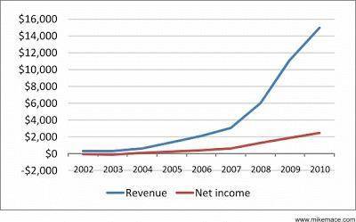 上图中,蓝线是营收,红线是净利。可以看到,在衰退之前,黑莓手机的营收趋势是相对完美的。