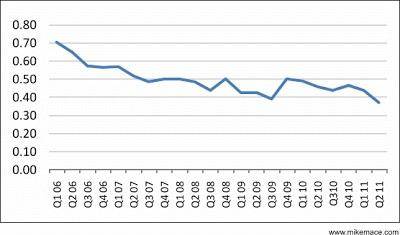 就像iPhone有AppleID一样,黑莓手机也有自己的BlackberryService。2006年,黑莓公司每卖出一部手机,就会有0.7个人注册BlackberryService,也就是成了它的新用户。而这个数字在2011年跌到了0.37——换句话说,这时候的黑莓,每卖出2.7部手机才能得到一个新用户。这背后其实隐含的是,绝大多数的黑莓手机,都是被已注册过的老客户买走了。