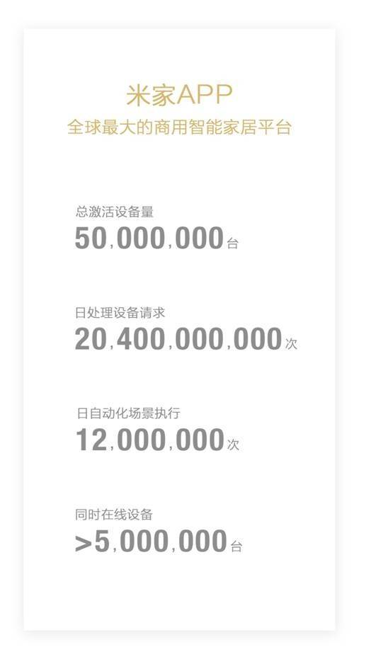 从上图我们可以发现,这个叫做“米家”的智能操控平台,当时的App总激活设备量超过5000万台;日均同时在线设备超过500万台;日均自动化场景执行1200万次。