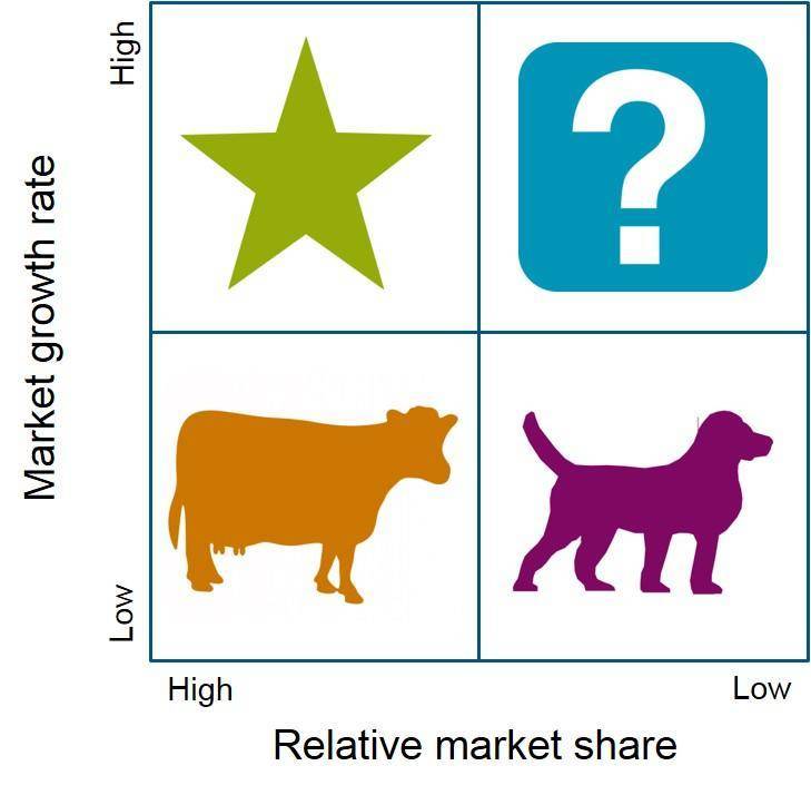 现金牛说明了,当前产品的市场占有率相当高,但是增速慢,这往往是成熟、并且可以持续获得最大利润的阶段,它代表了一家公司当前的辉煌;而问号的意思是,这个产品虽然当前市场占有率很小,但是增速极高,未来可能成为爆款,它代表了一家公司可能的未来。