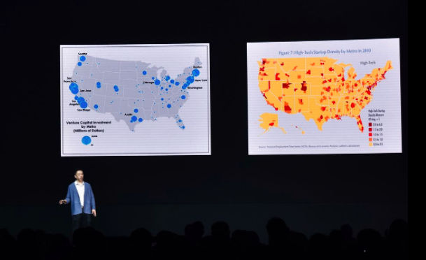 通过热点图片可以看出,硅谷早不是创新中心了。因为现在的创业向各个基础行业渗透,早就不能局限在互联网的领域。这样就更加凸显硬中心、硬制造的能力,美国东岸明显比西岸强。而现在美国创业的热点,其实是在科罗拉多州,因为这一轮的创业是以高校为起点的。