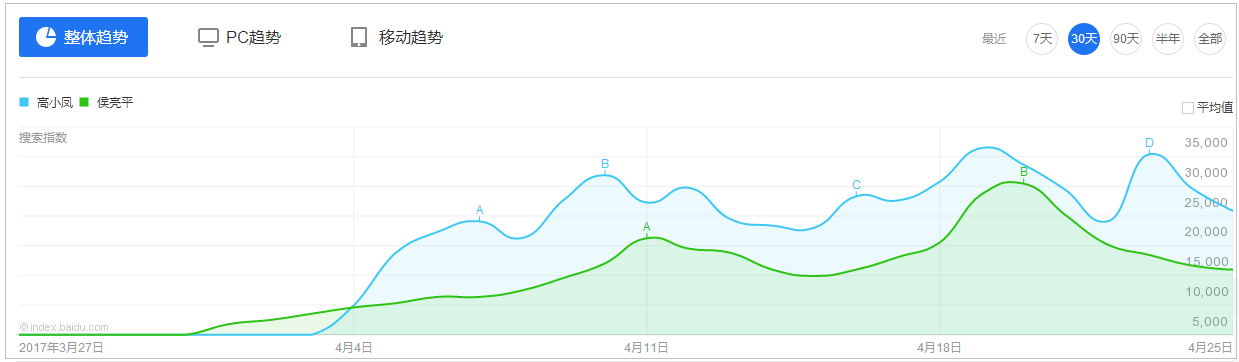 百度指数显示“李达康”(上图蓝色曲线)的指数可谓完爆“侯亮平”(绿色曲线)的,后者的指数甚至还没一个40多集后才出场的角色——“高小凤”(下图蓝色曲线)要高。