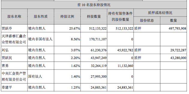 另外,财报显示,乐视网实际控制人贾跃亭持股数量为512,133,322,其中已有497,793,908股处于质押状态,占比超97%;贾跃民持股数量为43,947,249,其中已有43,280,000股处于质押状态;乐视控股持股数量为11,941,156,全部处于质押状态。