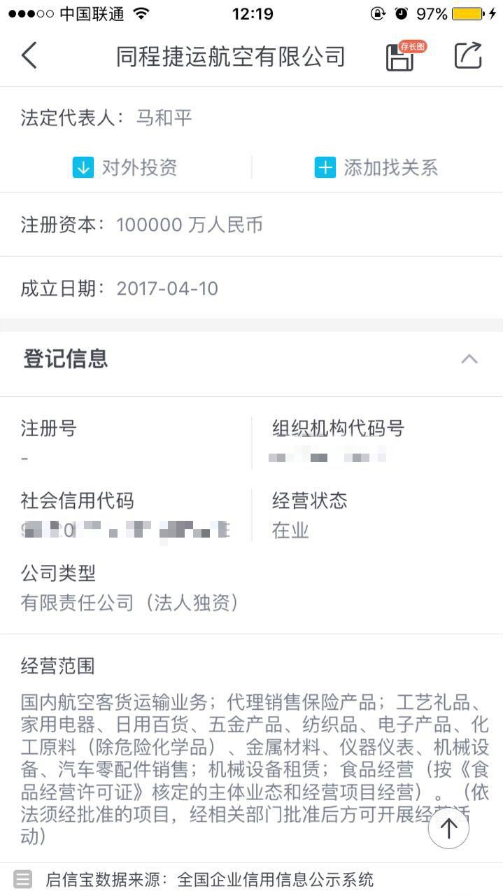 4月27日,有媒体报道称同程创始人、同程网络总裁马和平透露同程旅游将以南通兴东国际机场为主运营基地,注册资本10亿元,筹建成立同程捷运航空有限公司,作为扎根南通,服务南通的首家待批筹的基地航空公司。钛媒体查询企业工商信息得知,同程捷运航空公司已于4月10日注册成立。