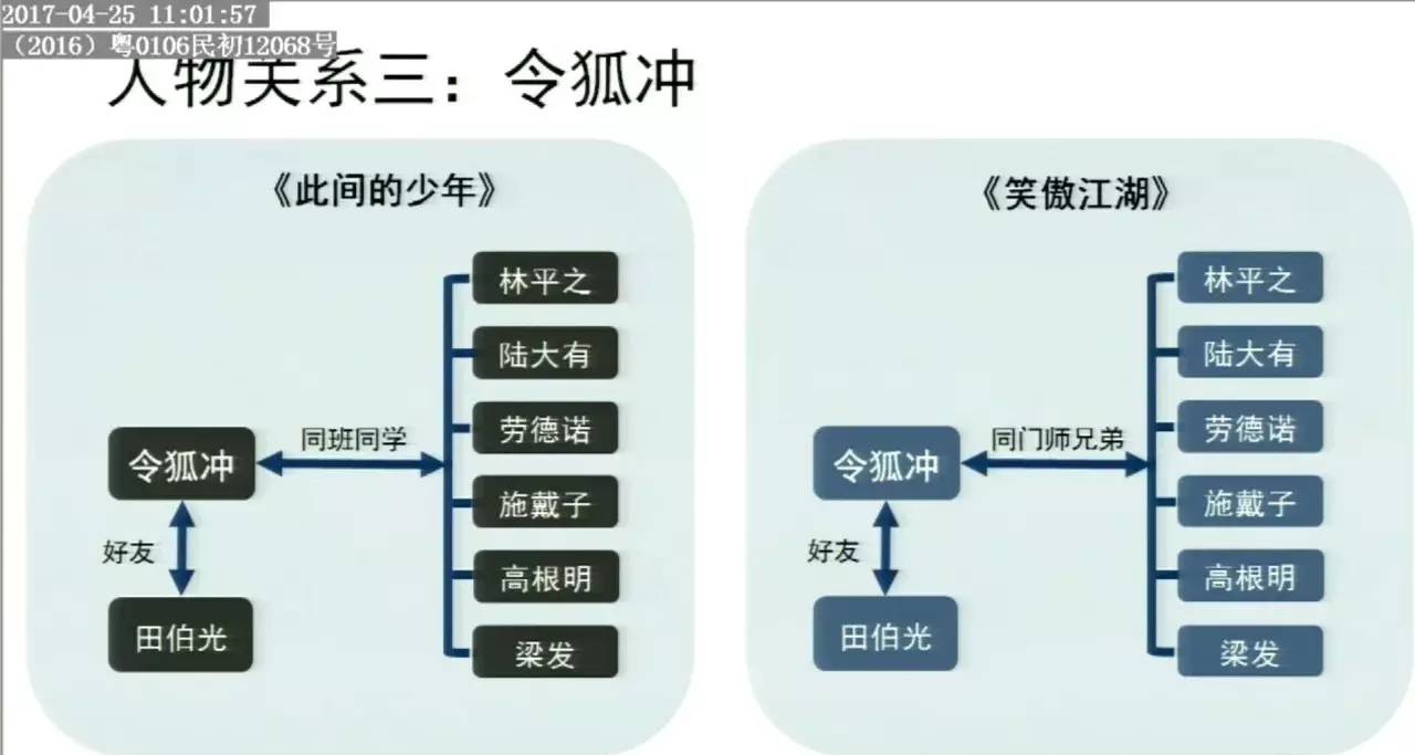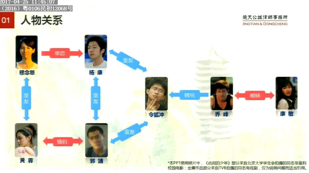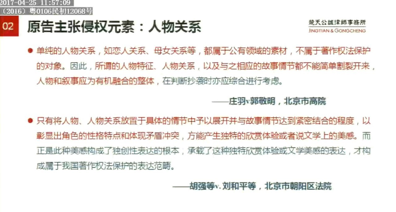 此外,江南一方主张,江南对故事情节进行了再度创作,故事类型、背景、主题结构、主要情节和具体情节均明显不同,个别相似仅停留在最抽象的人物基本特征,并不构成实质性相似,并没有侵犯金庸的权益,如人物关系方面,父母关系、师生关系、情侣关系等抽象层面相似,但是这些是公有领域的素材,不是著作权法保护的对象。